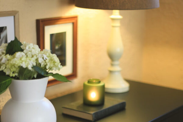 季節のお花をあしらって、色味にこだわったライトで出迎えてくれる玄関、ふんわりといい匂いで癒やされる